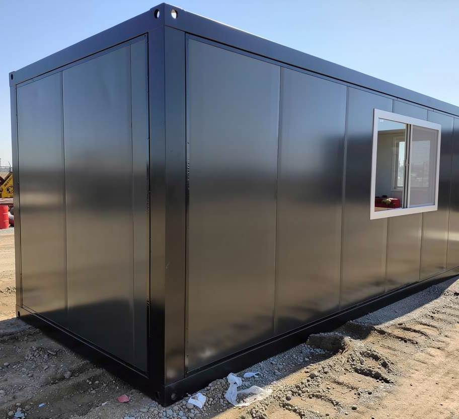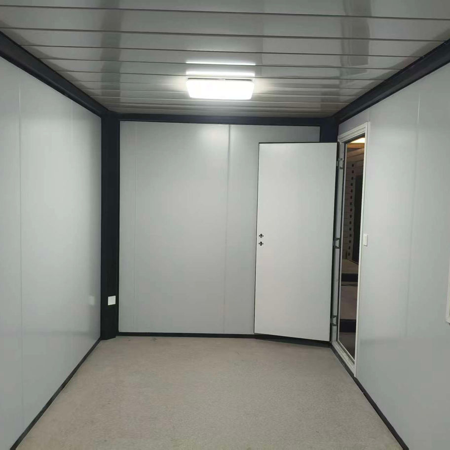 5.8mの単体ユニットハウスが入庫しました。外観は灰白色に塗装され、内壁は滑らかで平坦です。5センチの断熱層が備わっています。照明器具は付いていませんが、引掛けシーリングがあります。